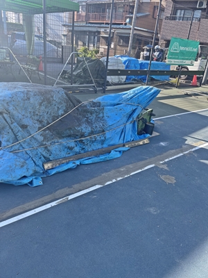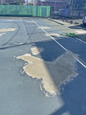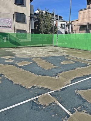 テニスコートの改修 長年の使用での、コートの凹みやひび割れ等を均す作業を行なっているようだ。 順調に進んでいるが、毎日殊の外暑く、作業の人は本当に大変だ。 頭が下がる。 意外と若い人たちがやっているんだよ。