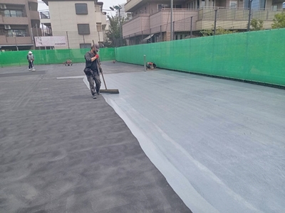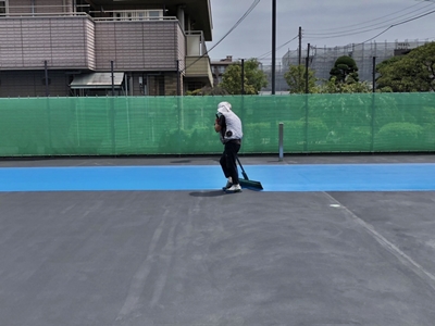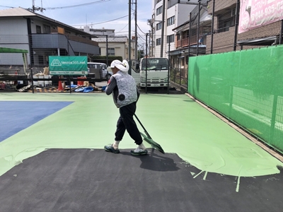 テニスコートは、下地をしっかりと慣らし、遂に色を入れ始めた。