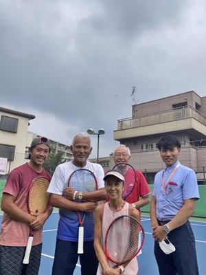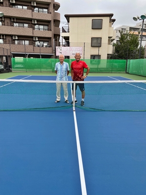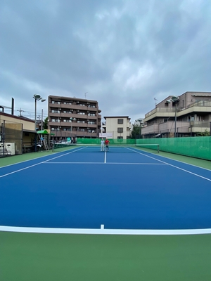 テニスコートがリニューアル 2週間の施工が終わり、テニスコートが美しく生まれ変わりました。 今日がテニスコートの受渡し式でした。 今回のリニューアル工事では、施工業者の方々が、暑い中本当によく頑張ってくれました。 こんなに美しいテニスコートになって、本当に感謝しています。 スポーツサーフェスの大川くん、オーナーの井田さん、スタッフ赤土と名村と、新しいコートでパシャリ。