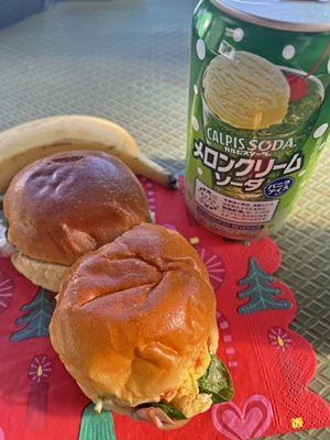 ワイフが作ってくれたサンドイッチとバナナを持ってテニスコートへ。
