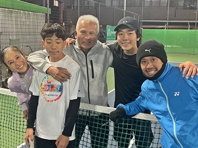 トモキが挨拶に トモキが来年早々シンガポールに行ってしまうので、最後の挨拶をしに240テニスカレッジ来たんだ。 もっと一緒にテニスをやりたかったけど、仕方ないよね。 運動能力が素晴らしいから、シンガポールでもずっとテニスを続けてくれることを祈るばかりだ。 今日は、久しぶりのテニスだったが、無難にこなしていたね。