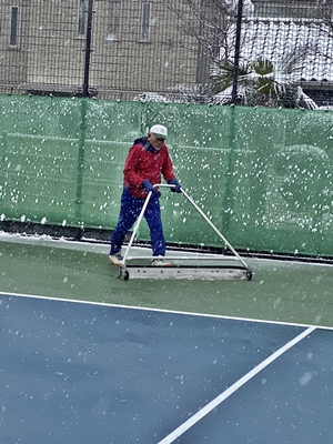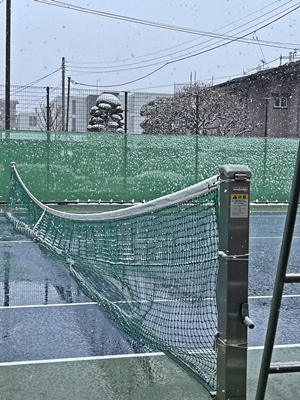 テニスコートにも雪 今日、久地は朝から雪。 午後2時過ぎまでは雪が降り止まず、ビックリだった。 今年初めての雪だと思う。 明日土曜日にテニスコートが使えないと困るので、雪が積もらないよう、何度も何度も必死で雪を払い除けた。 午後3時頃からは雨になったので、「明日は朝から何とかテニスが出来るのでは?」と期待している。