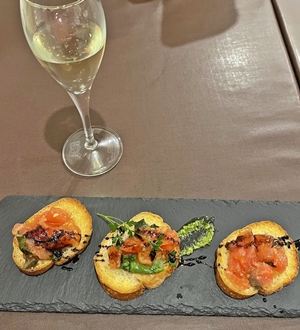 この写真は、ブルスケッタとハウスワインだ。