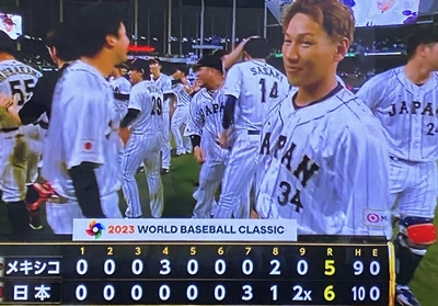 WBC準決勝 日本サヨナラ勝ち メキシコとのWBC準決勝戦、絶えずメキシコがリードし、日本は、9回まではチャンスがあるのにメキシコチームに追いつけない嫌な展開であった。 最後の最後で、昨年王さんの記録を抜いた、三冠王の村上がサヨナラ弾を放ち、日本が勝利した。 本当に奇跡の決勝進出であった。 久しぶりに泣けた! 明日のアメリカ戦も、日本のチーム力を出せれば勝てる、と信じている。