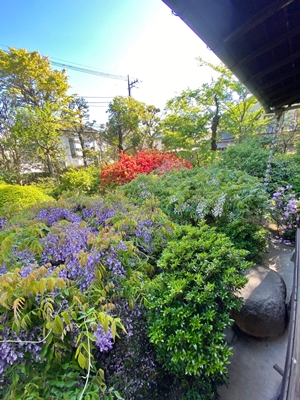 藤棚 一般的には、藤棚というと高い所から藤が垂れ下がっているイメージ。 ここの藤は縁側から鑑賞できるよう、地面から1メートルの高さに設えているそうだ。 目の高さで見る藤は、絨毯が敷かれているな感じさえする。 上から眺める光景は、圧巻だ。 藤越しに見えるツツジも素敵だった。 知人の家にて。