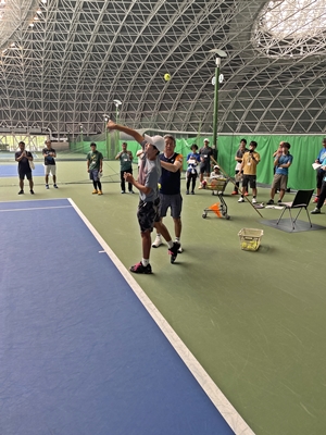関西での研修会 昨晩から関西の芦屋に入り、関西テニス協会主催の研修会に参加している。 プロツアーでよく戦った竹内映ニプロが、研修に集まった方々を指導してくれている。 関西テニス協会会長の馬場さん、テニス協会理事の植田くん、竹内映ニプロ、ビーンズドームに案内してくれた姉と共に記念に写真を撮った。 研修はサービスに特化した授業で、ジュニアを育成するのに凄く勉強になる。 本当によく勉強していると感心した。 もちろん自論もあるが、参った! 今後ももっとテニスを勉強して育成の役に立ちたい。