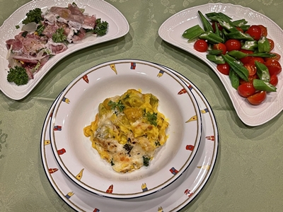 生ハムのサラダ、プチトマトを使ったサラダ、カボチャとジャガイモのグラタン。