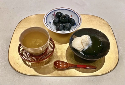 今日は巨峰と、濃茶の葛餅にバニラアイスを添えて。