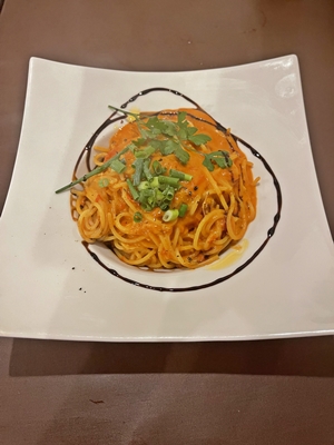 スパゲッティ 今日は近くのイタリアンレストラン、カレンでワタリガニのトマトソーススパゲティーを食べた。 ブルスケッタ、イカ墨のコロッケ等のサイドメニューもいけているが、メインのスパゲティーは最高に美味い。