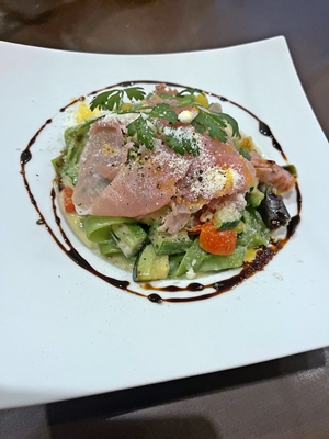 美味しそうなパスタ 今夜は、近くのイタリアンレストラン カレンで食事。 生ハムと夏野菜のさっぱりとしたクリームソース、ほうれん草入り生フェットチーネをオーダー。 ゴーヤもはいっていたよ。 最高に美味しかった!