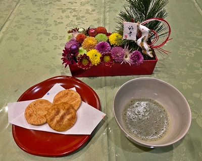 群馬の味、焼き饅頭せんべいを抹茶で、味わう。