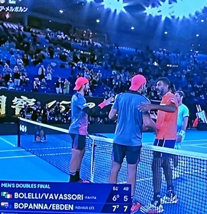 全豪オープン 男子ダブルス決勝 43歳のインド ボパンナ、地元オーストラリア エブデン組が、イタリア ボレッリ、ババソリ組を7-6. 7-5のストレートで破り、優勝した。 この大会後、ランキングでボパンナは世界のNo.1に、エブデンはNo.2になるとのこと。 素晴らしい! ただ、ユニフォームを揃えたイタリアペアの方が素敵に見えたよ。