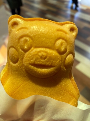 おやつ レッスンの合間に、いつもおやつを食べます。 今日は、くまモンの型をした、人形焼高級バージョンを頂きました。 とにかく生地がふわふわで、中に美味しいアンコが詰まっているのです。 そのクマもんが、何とも言えず美味しかった。
