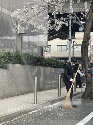 今朝、桜の花びらを片付けている街の人を見かけた。