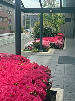 ツツジが美しいエントランス 東京ローンテニスクラブのエントランスには、美しいツツジが待ち構えている。 現在、クラブの試合が行われており、毎週末東京ローンに行って試合をしている。 普段はなかなかクラブには行けないので、なんとなく緊張するが、美しいツツジが気持ちを和ませてくれる。