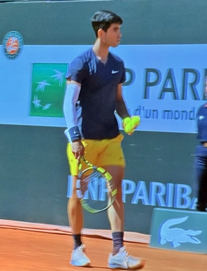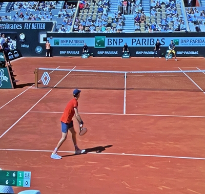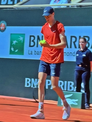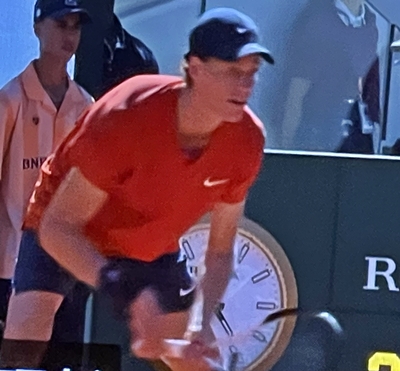 注目の男子準決勝 全仏オープン男子シングルス準決勝戦、シナー対アルカラスの試合が始まった。 シナーが第1セットを6-2で奪い、第2セットはアルカラスが挽回して6-3で取り、第3セットに入った。 シナーが少し痙攣を起こしているようだ。 一か八かの強打でアルカラスを追い込んではいるが….? どうなるのであろうか….?