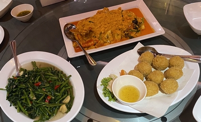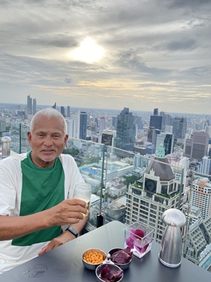 夕方から バニアンツリーホテルの61階にあるルーフトップバーに行った。 上から見下ろす風景は、恐ろしいほど高く怖かったが、太陽が沈むにつれ夜景に変わっていく様子が、何とも言えない良いムードであった。 その後、プーパッポンカレーで有名なソンブーンという老舗のタイ料理レストランで、思う存分食べた。 素晴らしい味であった。 以前行ったことがあるはずなのに、全く覚えていない…. 何故か⁇