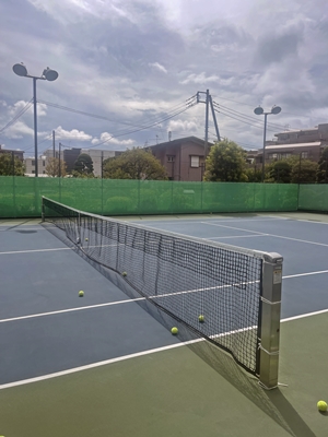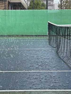テニスコートは、突然の土砂降りの雨で水浸し。