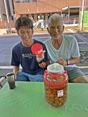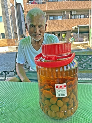梅酒が出来上がったぞ! 3カ月前に、井田さんの庭の、梅の木に生った梅をいただいた。 300個位はあったか? 「どうしようか?」と迷った結果、我々で梅酒を作ることに決めた。 大きな梅酒用の瓶を買ってきて、梅の実を干し、選別して、焼酎、ザラメ、ホワイトリカーを入れて、美味しい梅酒が出来ることを祈った。 9月1日に出来上がる計算であったが、昨日は、台風の影響でテニスコートはお休み。 今日お披露めとなった。 不安であったが、お酒好きの飯島が遊びに来ていたので、試飲させた。 兎に角びっくりする程美味い、と大絶賛!