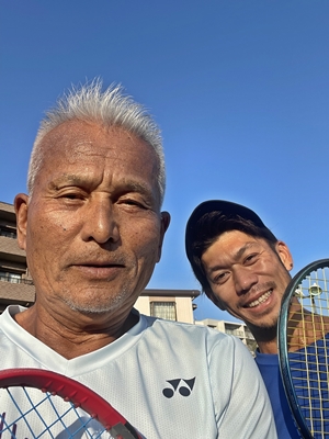 飯島が遊びに来たので、僕の左手でのテニスのヒッティングをしてもらった。