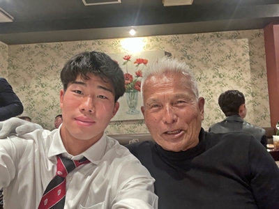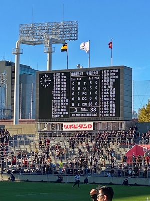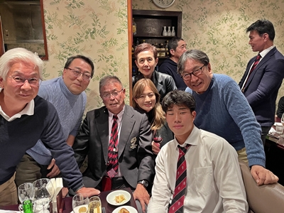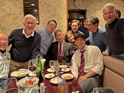 ラグビー早慶戦 伝統のラグビーの早慶戦は、57対3で早稲田が圧勝した。 試合後、藤原さんの声がけで、祝賀会。 現役の早稲田ラグビー部員が3人も参加してくれ,会が大いに盛り上がった。 僕は、関西出身の有望株の矢崎君と写真を一緒に撮らせて貰った。