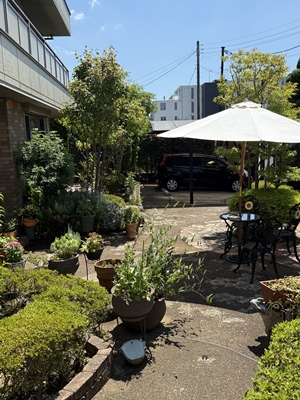 テニスコートは暑すぎる! テニスコートの隣にある井田さん庭は、緑が多く、この暑さの中でも涼し気だ。 あまりのテニスコートの暑さに、ついつい緑の中の白いパラソルを見てしまう。 ああ、あの下でのんびりしたいなぁ!