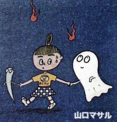 山口マサル氏から 僕は、小さい頃夏休みに肝試しの体験をした事を、覚えている。 この画像のような、微笑ましい感じではなかったような気がする。 山口マサル氏らしい、素晴らしい作品だと思います。 これを見て、少し涼しくなったかな?