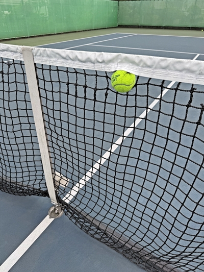 ラケットで思い切り打ったテニスボールが、ネットにめり込んでしまった。